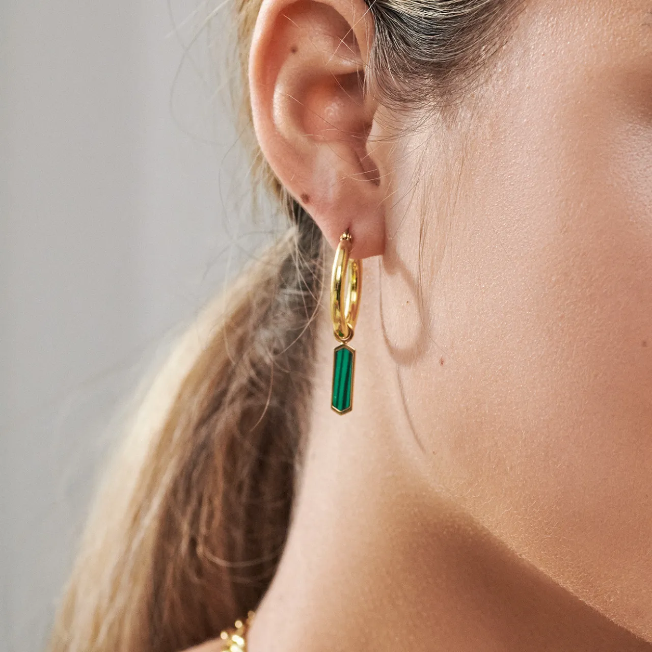 L’élégance intemporelle sera toujours à la mode. Avec leur pendentif vert hexagonal, ces créoles Essentielle de coul…