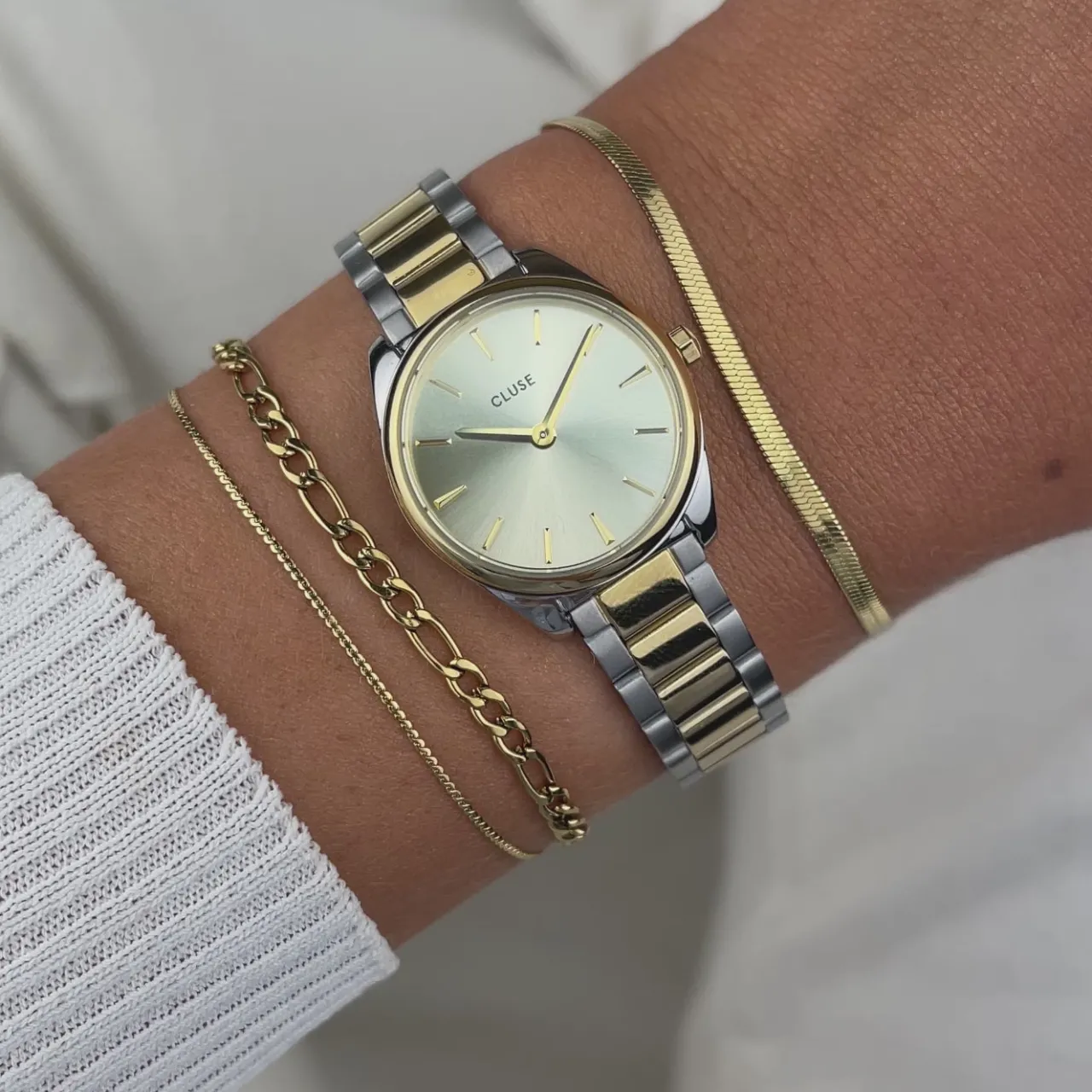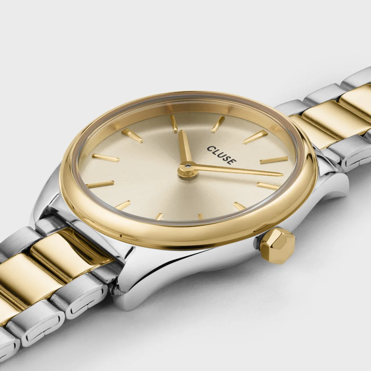 Le plus petit modèle de notre collection Féroce la plus vendue, mais unique en son genre. La montre CLUSE Féroce Mini pour femmes combine harmonieusement minimalisme et détails épurés marqués. La montre bicolore se distingue par son design raffiné, associant des touches argent et or pour obtenir un look intemporel et contemporain. Voici la pièce minimaliste et séduisante parfaite pour compléter votre look. Vous pouvez facilement ajuster vous-même la taille du bracelet.