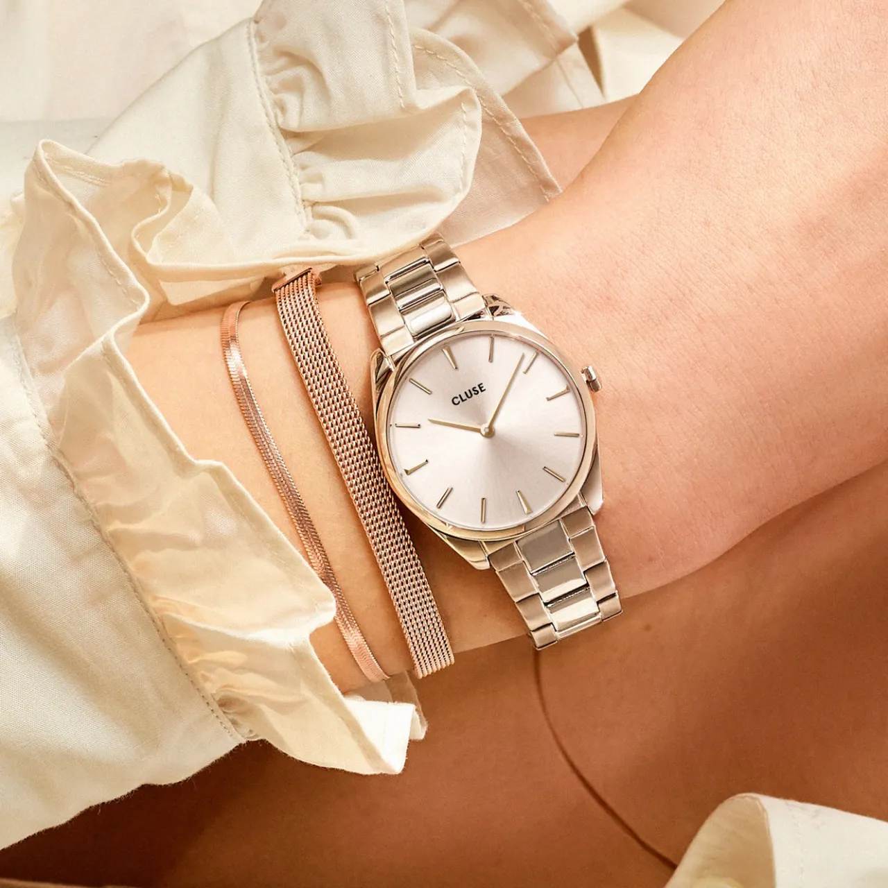 Cette montre au charme contemporain vous accompagne élégamment dans votre vie quotidienne et lors des occasions spéciales. La taille de la Féroce Petite a diminué, mais pas son amour du détail. Son boîtier de 31,5 mm est délicat et raffiné. Le boîtier or rose est entouré d’un bracelet en acier de la même couleur, pour une finition féminine et chic. Le bracelet de la montre Féroce Petite est interchangeable avec n’importe quel autre bracelet-montre CLUSE de 16 mm. La couleur Or Rose Light est plus claire que notre couleur Or Rose habituelle. Pour ajuster le bracelet, nous vous recommandons de vous rendre chez votre bijoutier ou horloger habituel.