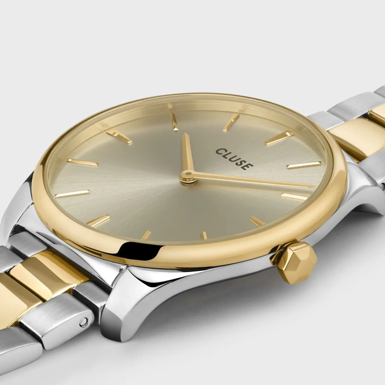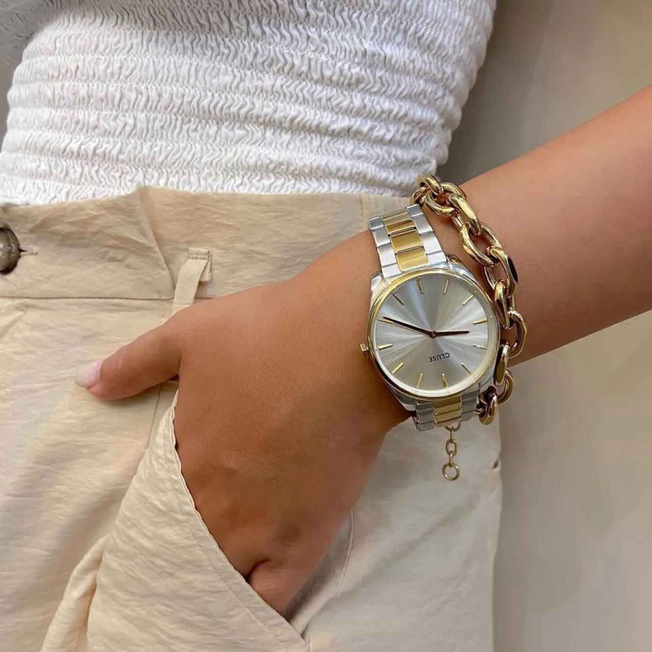 Si vous êtes du genre minimaliste et glamour, cette montre CLUSE Féroce bicolore vous propose le meilleur de ces deux styles. Une ode à notre penchant pour le minimalisme et la joie de vivre. Un boîtier de 36 mm raffiné mais affirmé par sa taille, qui sublimera les poignets de taille moyenne. Le cadran or s’intègre parfaitement au boîtier bicolore argent & or et au bracelet à maillons. Le bracelet du modèle Féroce est interchangeable avec n’importe quel autre bracelet de montre CLUSE de 18 mm. Pour ajuster le bracelet, nous vous recommandons de vous rendre chez votre bijoutier ou horloger habituel.