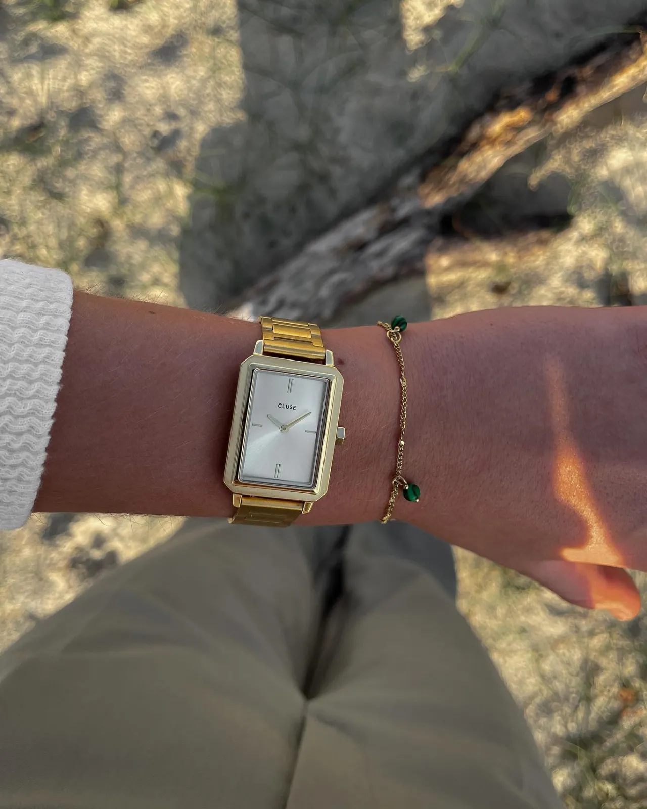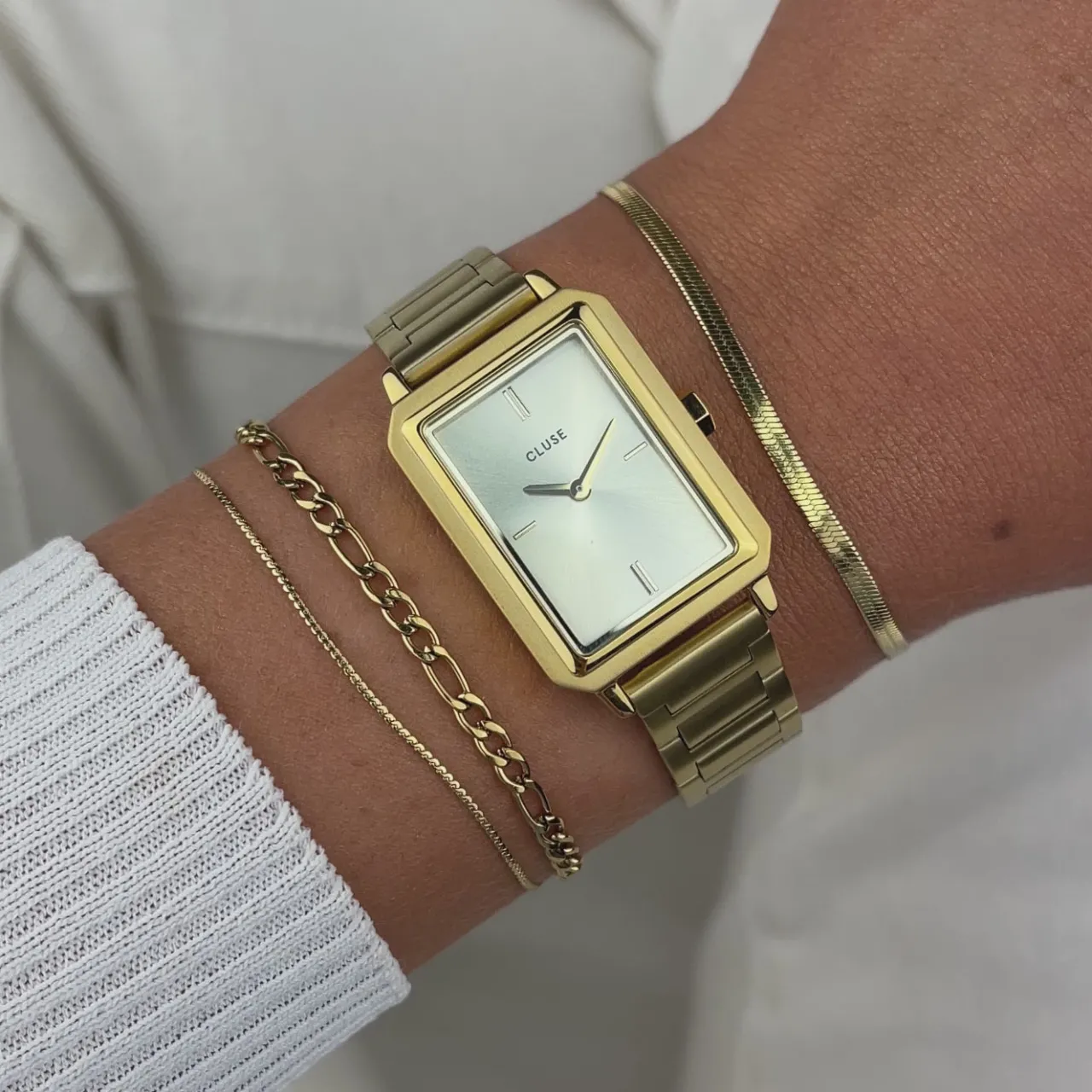 Brillez toute l’année avec la montre CLUSE Fluette pour femmes. Nous avons rehaussé notre emblématique Fluette dans un look entièrement doré, pour un design intemporel plein d’éclat. Dotée d’un boîtier rectangulaire doré poli de 30,6 mm, d’un cadran champagne soleillé et d’un bracelet à maillons en acier inoxydable de 14 mm couleur or. Cet accroche-regard à la forme rectangulaire unique et au style minimaliste a été soigneusement conçu avec un objectif clé en tête : offrir une montre sophistiquée à la présence forte. Vous pouvez facilement ajuster vous-même la taille du bracelet.