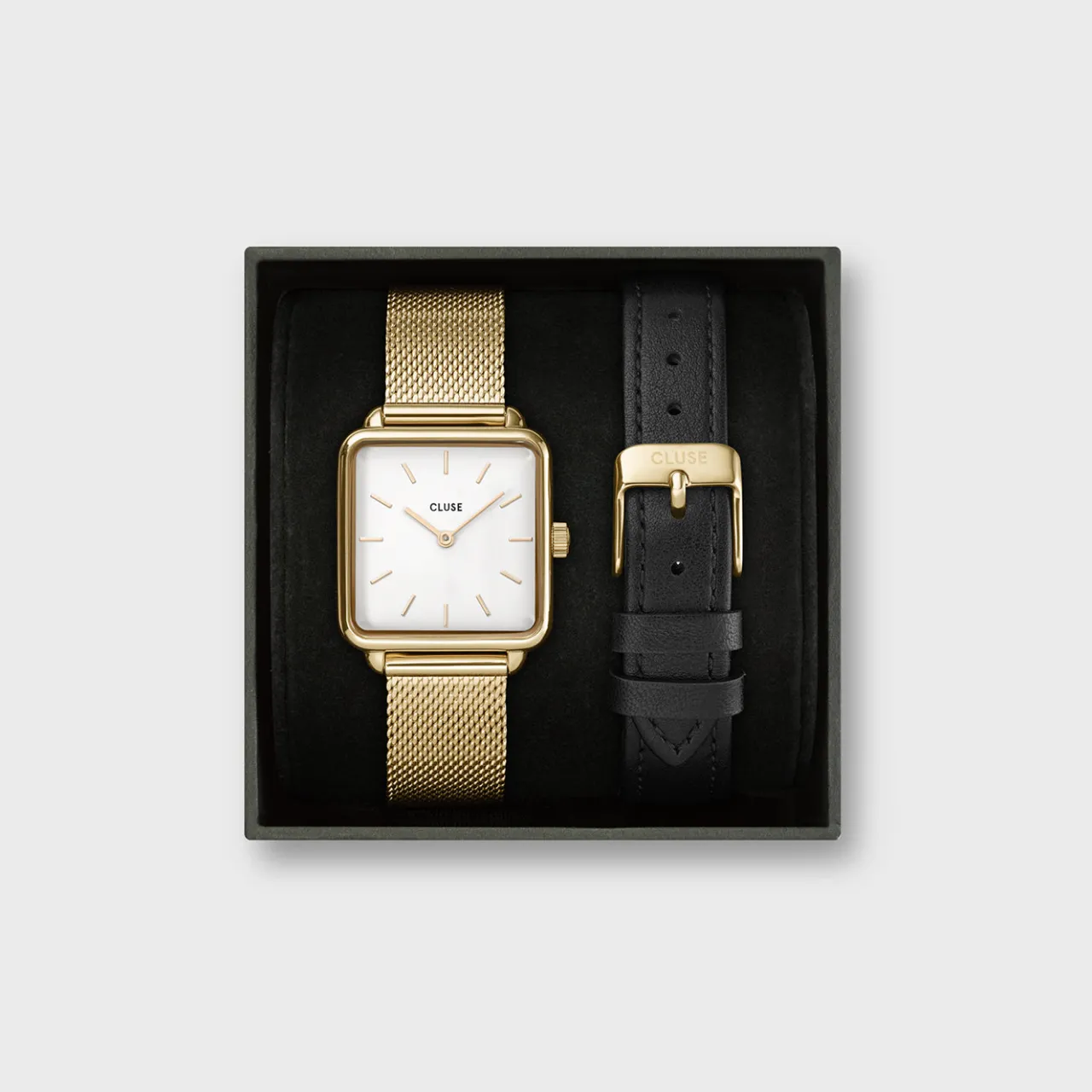 Dans ce magnifique coffret cadeau CLUSE pour femme, vous trouverez notre montre La Tétragone chic en couleur or, avec un bracelet en cuir noir supplémentaire. L’élégance sous la forme d’un boîtier carré aux bords arrondis. Notre collection La Tétragone est un jeu moderne avec les lignes, les structures et les formes. Dans ce coffret cadeau, vous trouverez notre chère La Tétragone Mesh White, au boîtier en acier inoxydable couleur or à la forme carrée caractéristique. Son cadran blanc et la finition polie de son boîtier apportent une touche d’élégance, tandis que la taille du boîtier (28,5 mm) prouve que la véritable beauté est souvent dans les petites choses. Avec un bracelet de 16 mm couleur or et un bracelet en cuir noir, ce modèle raffiné allie parfaitement intemporalité et design contemporain.