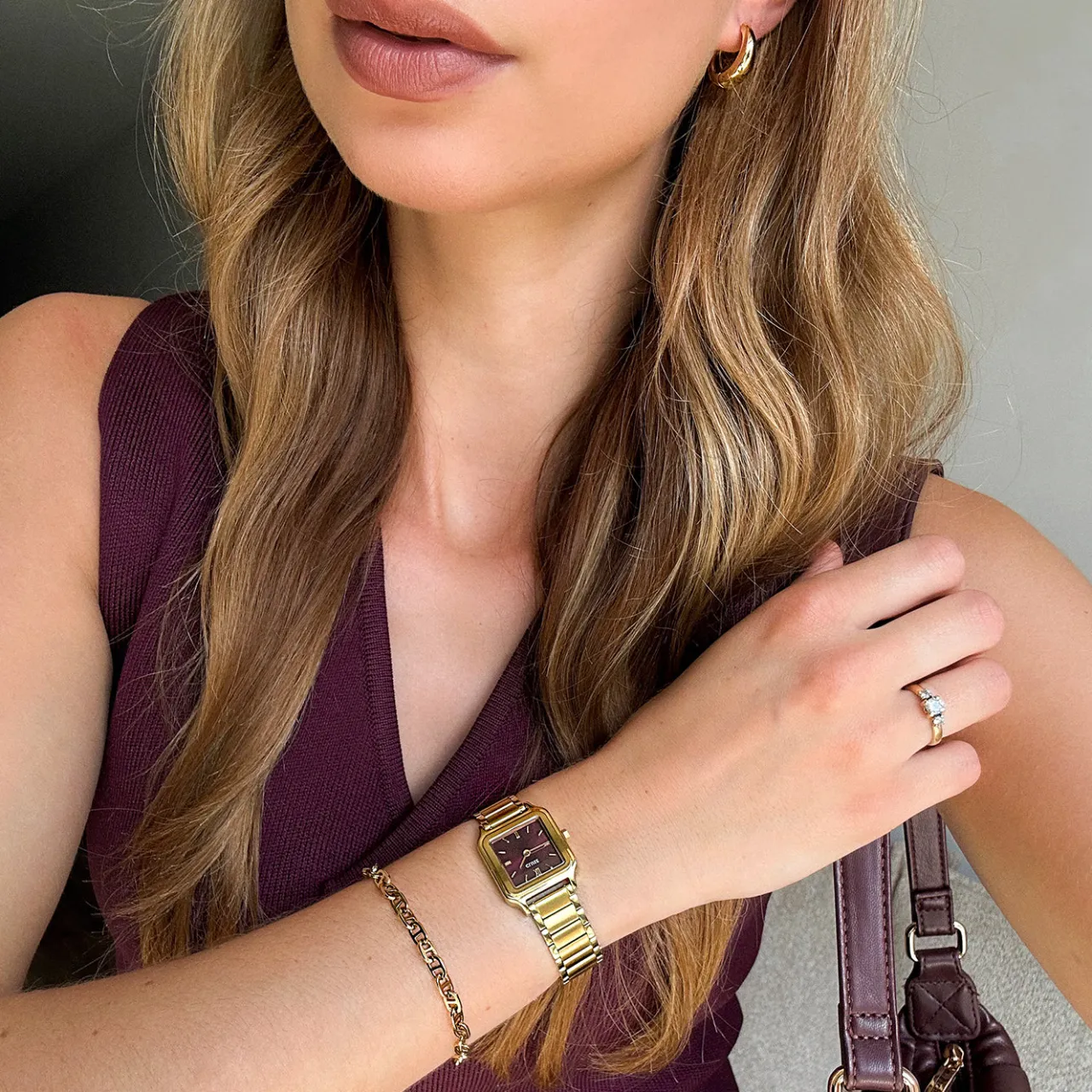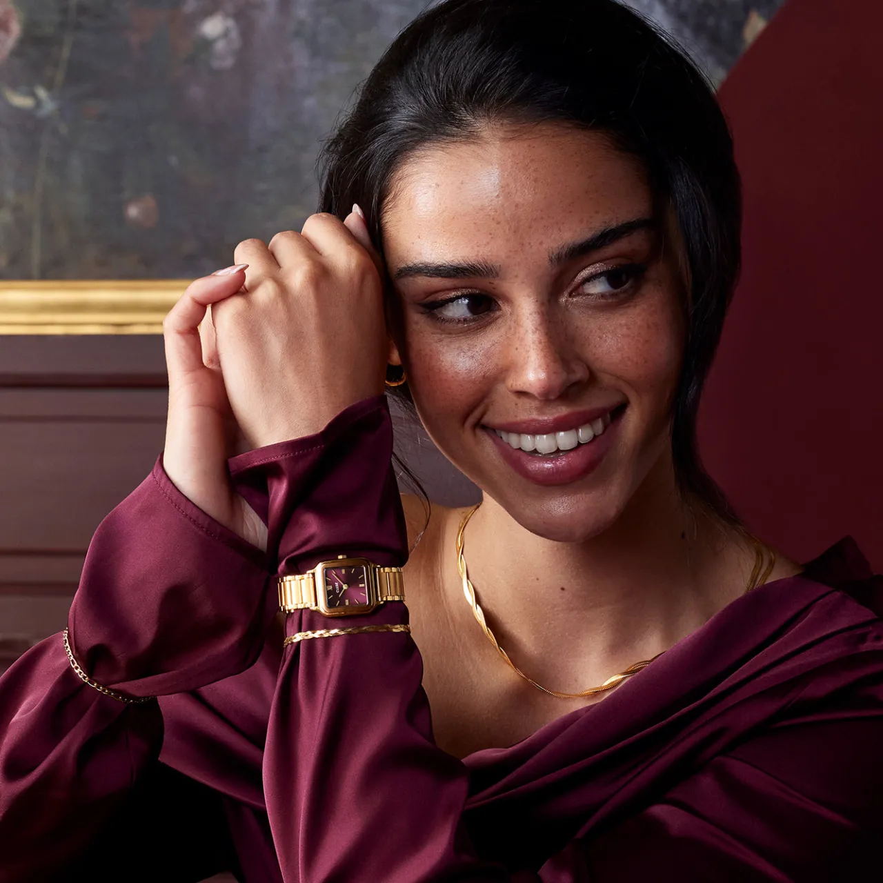 Ajoutez une touche de luxe et de sophistication à votre look grâce à la montre Gracieuse Petite pour femme. Elle est dotée d’un boîtier carré de 24 mm, de couleur or, d’un riche cadran cerise foncé et d’un bracelet en acier inoxydable de 14 mm à 3 maillons. Personnalisez facilement le look de votre montre avec n’importe quel bracelet de montre de 14 mm. Vous pouvez facilement ajuster vous-même la taille du bracelet de montre.