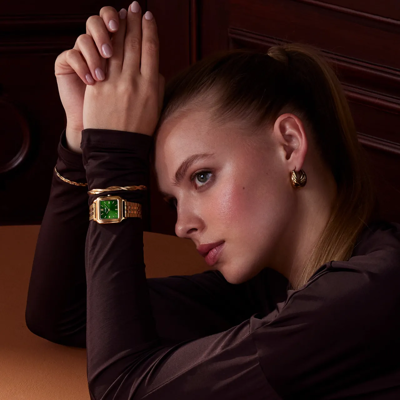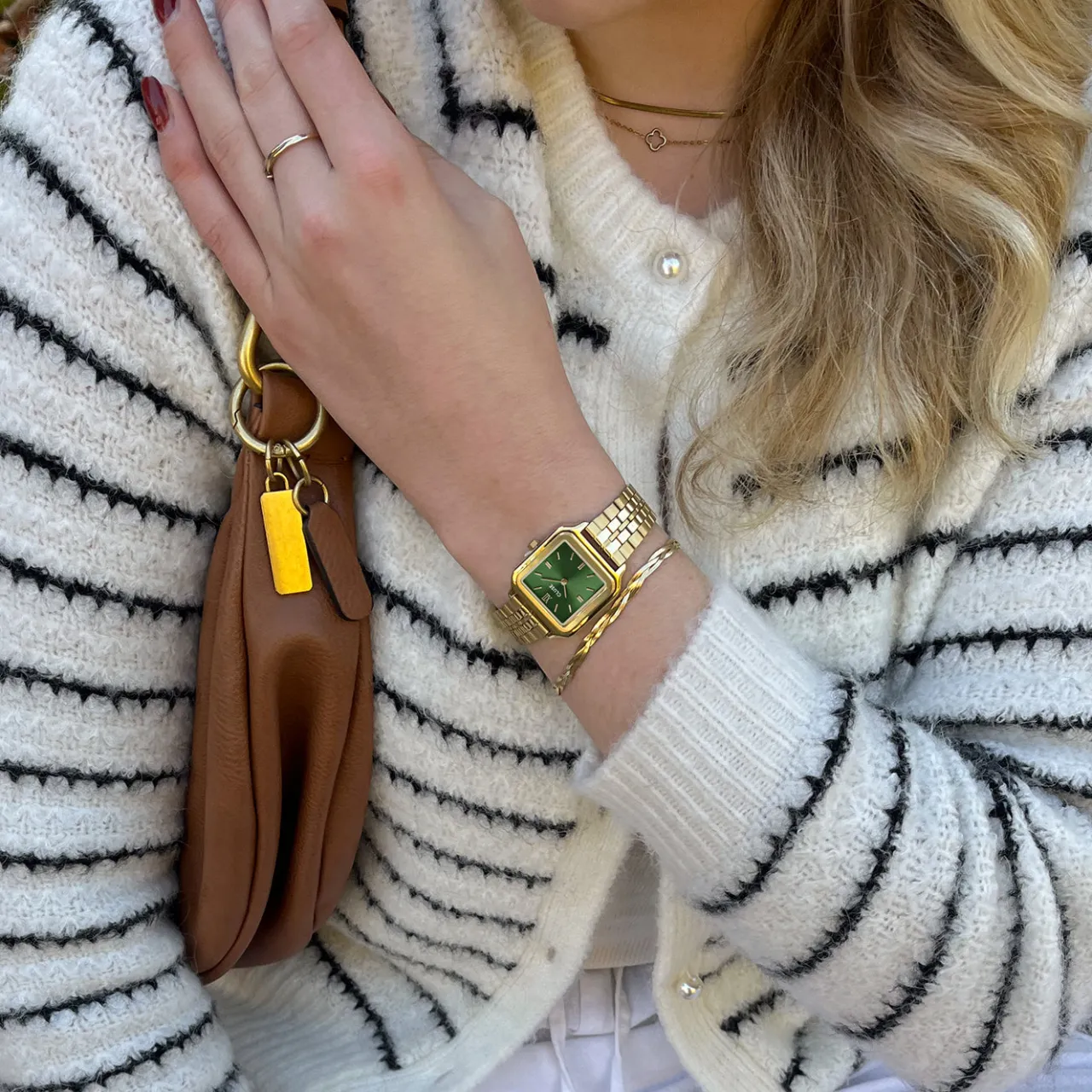 Ajoutez une touche de luxe et de sophistication à votre look grâce à la montre Gracieuse pour femme. Elle est dotée d’un boîtier carré de 28 mm, de couleur or, d’un majestueux cadran vert forêt et d’un bracelet en acier inoxydable de 16 mm à 5 maillons. Personnalisez facilement le look de votre montre avec n’importe quel bracelet de montre de 16 mm. Vous pouvez facilement ajuster vous-même la taille du bracelet de montre.