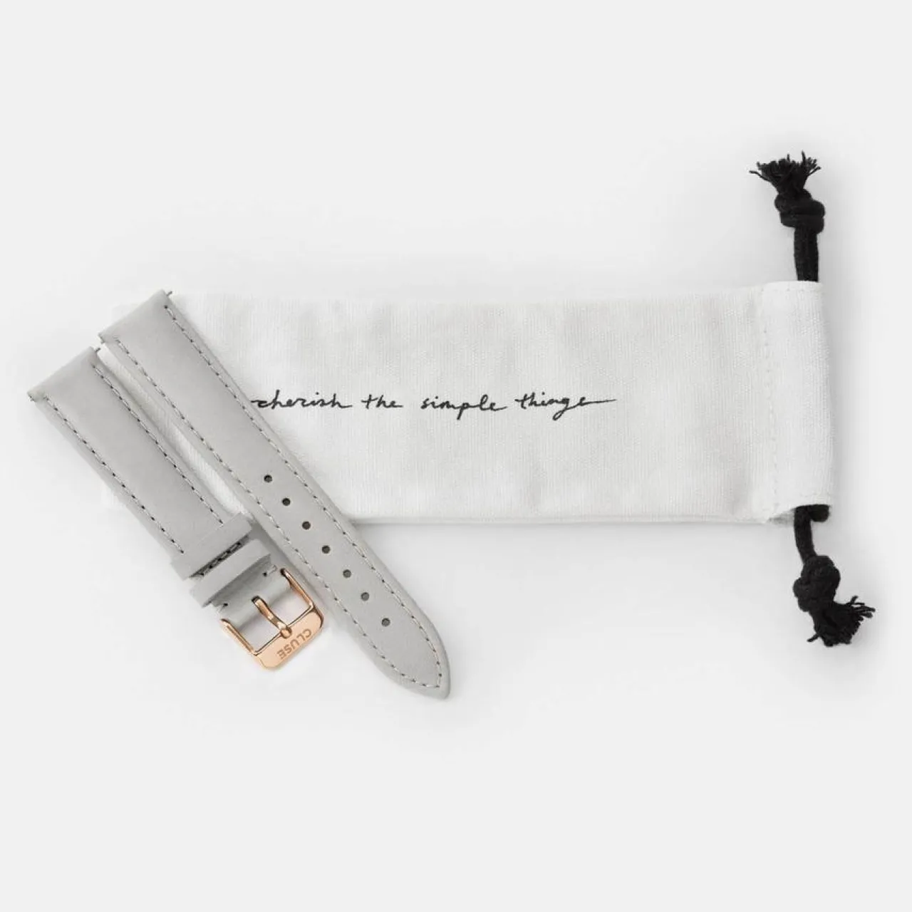 Un bracelet de montre sérieusement chic (largeur 18 mm) dans les couleurs emblématiques de CLUSE. Le cuir gris poudré est surpiqué à la perfection avec des pointes coniques classiques, une double boucle et une boucle de fermeture or rose en acier inoxydable. Le système à clipser permet de remplacer facilement le bracelet. La personnalisation de votre montre CLUSE n’a jamais été plus facile.